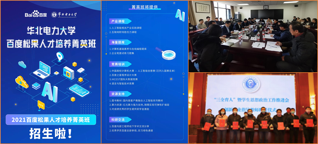 搭建创新创业平台,强化协同育人。为加强创新性、应用型、技能型等复合型人才培养,学院紧密结合行业和社会发展的需求,深入推进校企联合人才培养和协同育人工作。学院同百度公司共同承办中国高校人工智能人才国际培养计划同时,同步设立JAV在线 -百度松果人才培养菁英班,开展线上实践和线下交流相结合的免费授课。学院同国家电网公司大数据中心在大数据、人工智能、能源互联网等方向开展深度合作,并聘请了企业导师。为进一步提升学生创新创业实践能力,学院聘任了新一届13名创新创业指导教师,以促进学生实践能力的提升。
