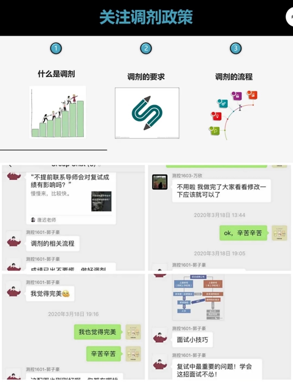 测控党小组由王哲同志作为代表为大家讲述研究生复试相关问题与技巧、调剂相关政策。王哲同志表示,复试是考研的最后一关,也是非常重要的一关,在准备复试时,要做到诚实守信、态度积极、独立思考,把自己最良好的状态展现在老师面前;联系导师时,邮件语气要礼貌而自信、内容主题突出,无论得到了导师怎样的回应都应虚心接受;复试结束后把心态放平、做到成不骄败不馁。对于需要调剂的同学,王哲同志介绍了调剂的政策、流程、要求,并表示要积极关注调剂政策,提前做好充足的准备迎接随时到来的调剂机会。