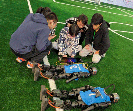 在JAV在线 于磊老师的指导下,8名队员分为线下突击与线上支援两组,形成双线联动、高效协同的作战体系。线下突击组高鑫、武增辉等5名队员驻守赛场,负责参数调整、代码部署与临场调试;线上支援组邓继伟、李梓敖、林斌3名队员远程同步,进行仿真验证、参数调优与程序迭代。面对仅有两周课余备战的挑战,团队多次前往专属训练场地,完成十余次针对性调试,持续提升机器人踢球精度、运动稳定性与反应速度。