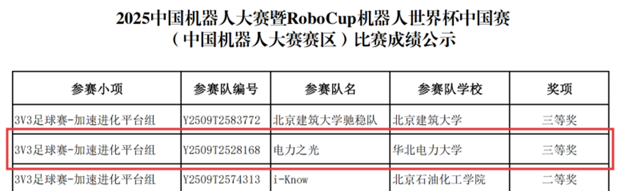 比赛过程中,队员们沉着冷静,越战越勇。首场比赛中,他们以3:1旗开得胜。随后两场虽遭遇突发光线干扰,全队依然沉着应变,在技术与策略调整上快速反应,拼搏至最后一刻。最终,“电力之光”队凭借扎实功底、高效协作与出色表现,荣获全国总决赛三等奖,为学校赢得荣誉,也展现了华电学子在机器人领域的创新潜力、实践能力与拼搏精神。